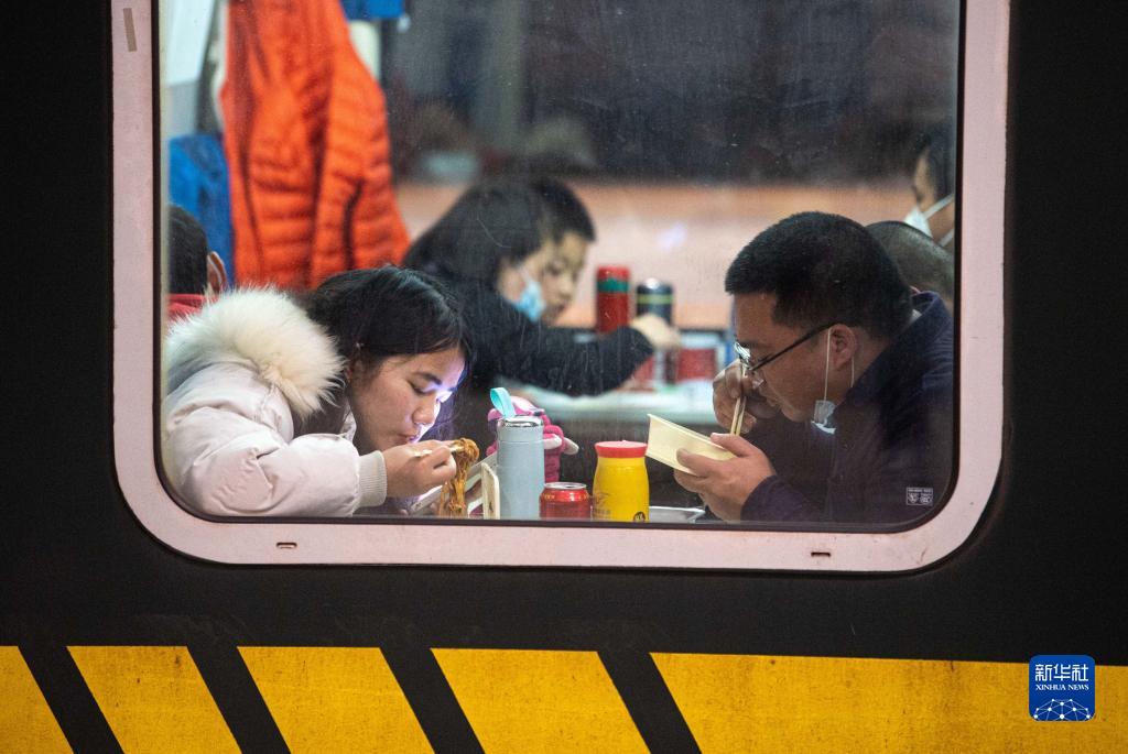1月18日,旅客在K209次列車上吃晚餐。