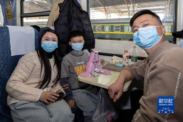1月18日,在1462次列車上,沈連杰(右)一家三口在回家的路上玩紙牌。時隔3年,沈連杰一家三口返回安徽蚌埠老家過春節。