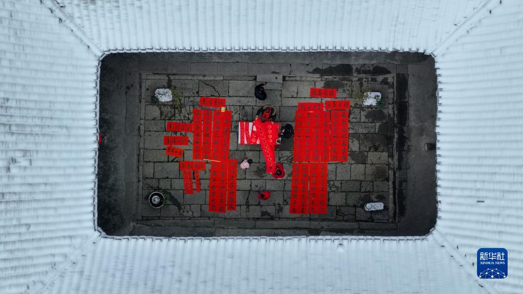 1月18日,在重慶市酉陽土家族苗族自治縣桃花源街道龍池村洞子坨傳統村落,當地書法愛好者在四合院里為村民書寫春聯。