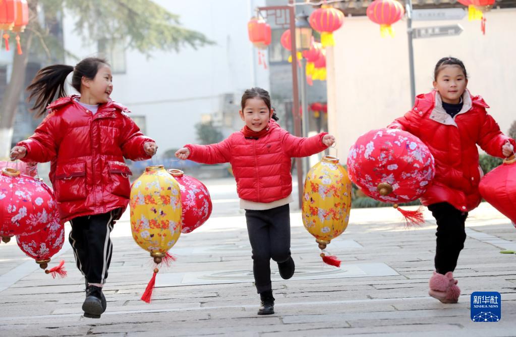 1月18日,在浙江省湖州市德清縣乾元古城弄堂里,小朋友們手提燈籠參加“古城非遺趕大集”活動。