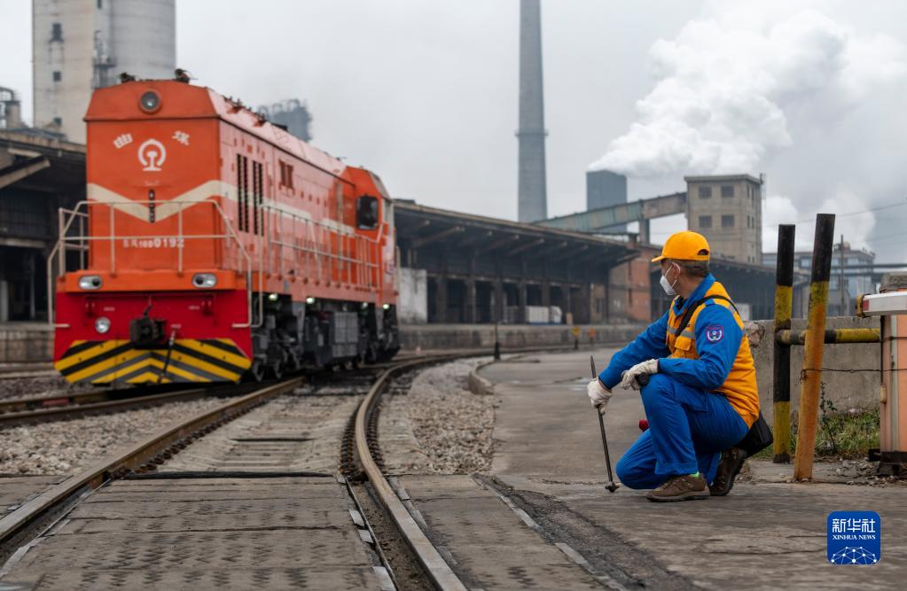 1月17日,彭顯雄在廠區鐵路道口等待一列火車頭通過。