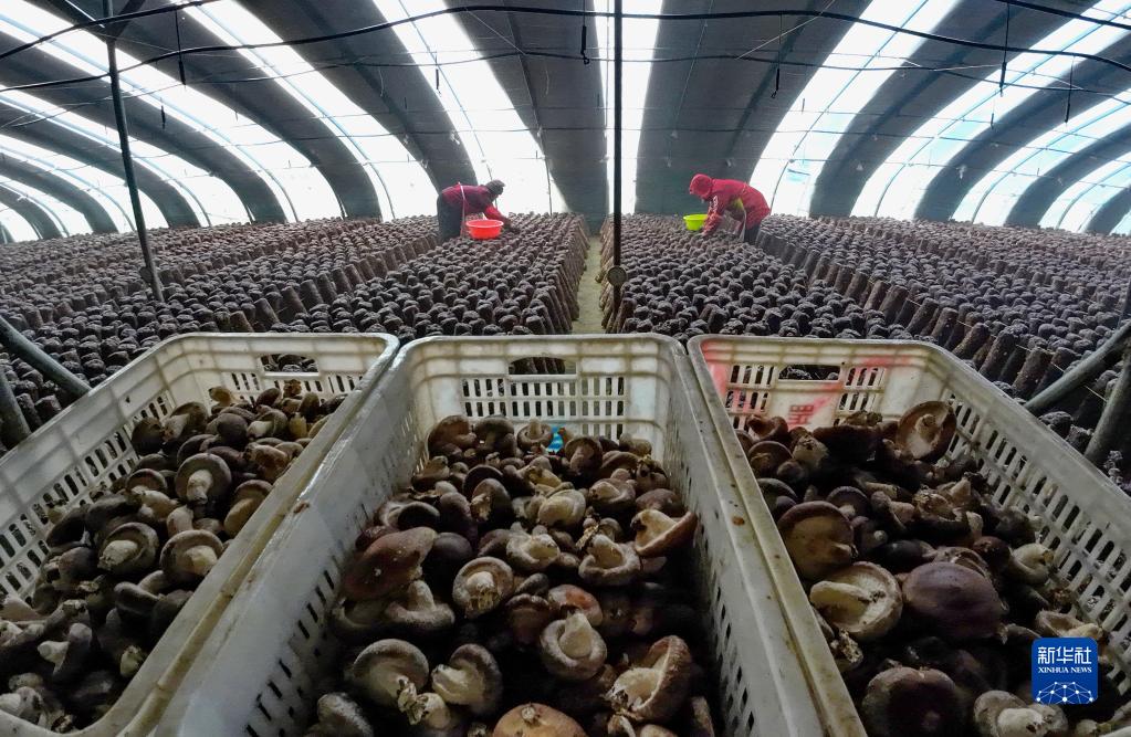 1月19日,唐山市豐潤區任各莊鎮的農民在大棚內采摘香菇。