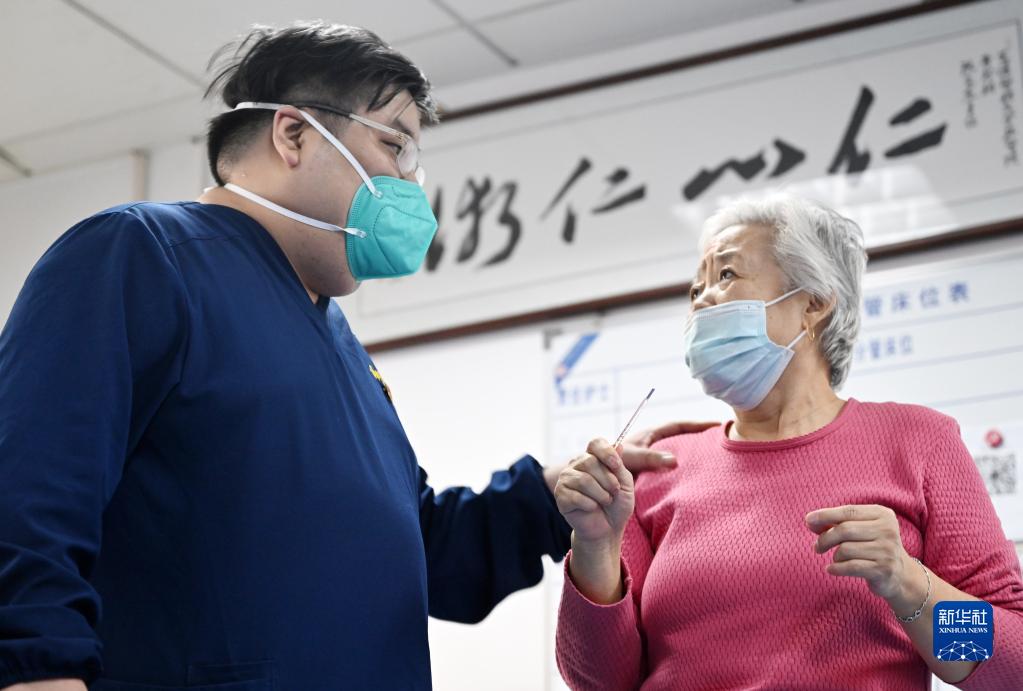 在天津醫科大學總醫院,劉洋(左)和一位老人交流(1月18日攝)。