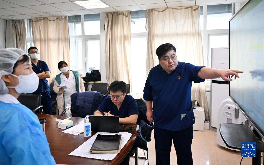 劉洋(右)在天津醫科大學總醫院主持急診分流救治專班調度會(1月17日攝)。