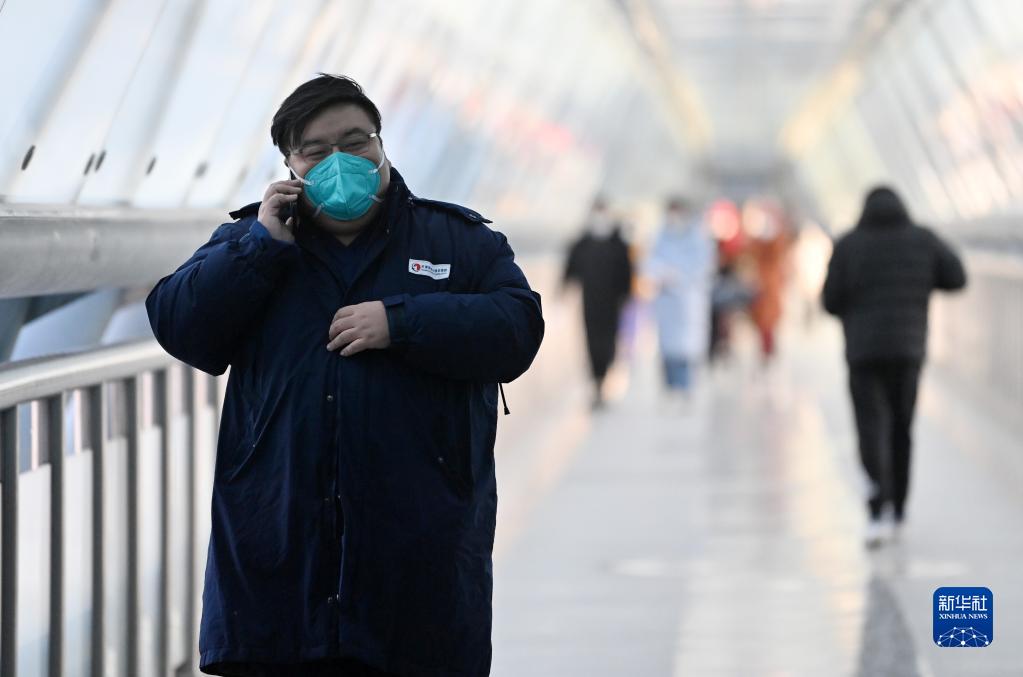 劉洋在天津醫科大學總醫院邊走邊接聽工作電話(1月18日攝)。