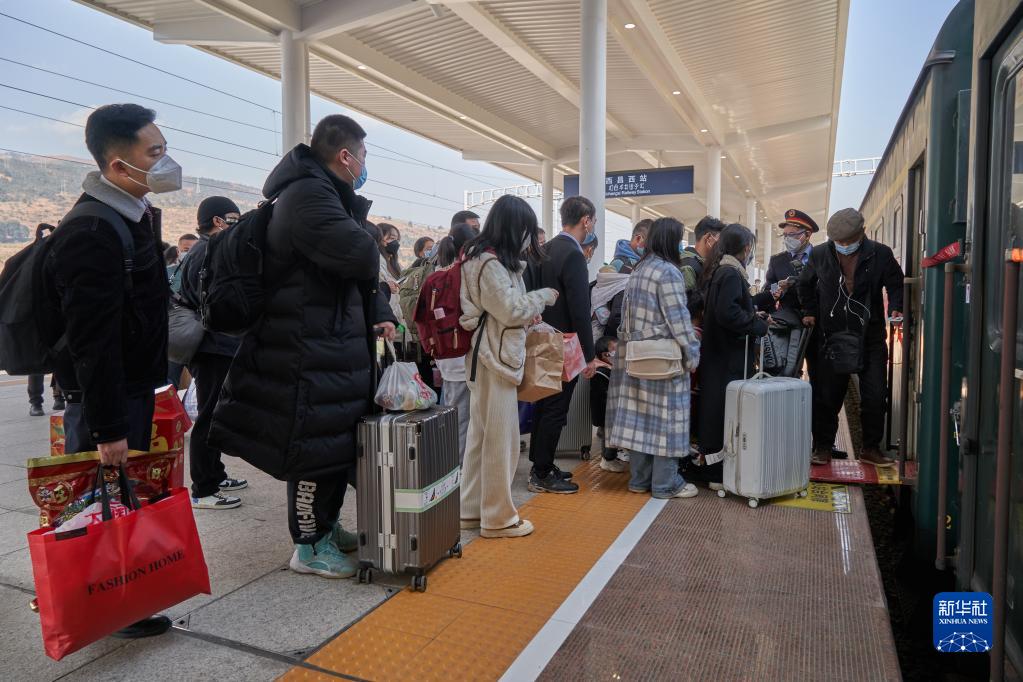 1月17日,在西昌西站,沙馬伍且(左一)結束當日值乘,換了便裝后轉乘K818次普速列車,前往家鄉越西縣。