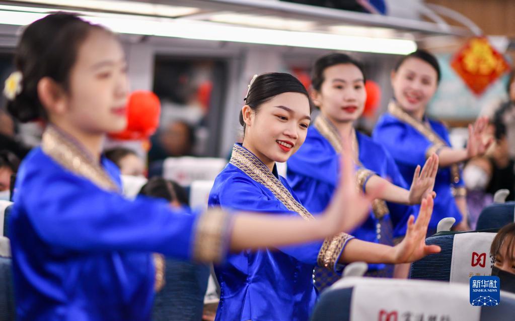 當日,奔馳在中老鐵路上的C272次列車車廂內,一場以“中老一家親,祥和中國年”為主題的列車春晚精彩上演。