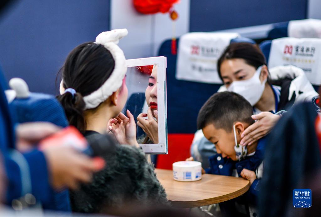 1月19日,演員在列車車廂內為演出做準備。