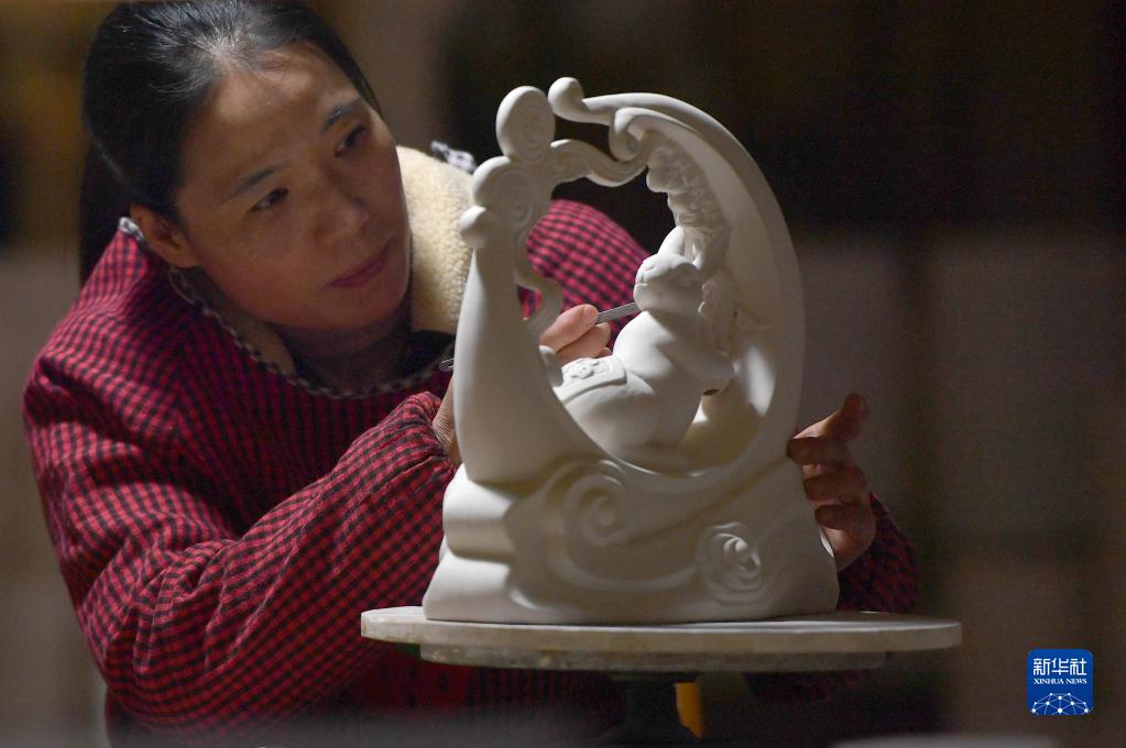 1月18日,在寶豐縣張八橋鎮一家汝瓷生產企業,汝瓷藝人在修飾汝瓷生肖兔素胎。