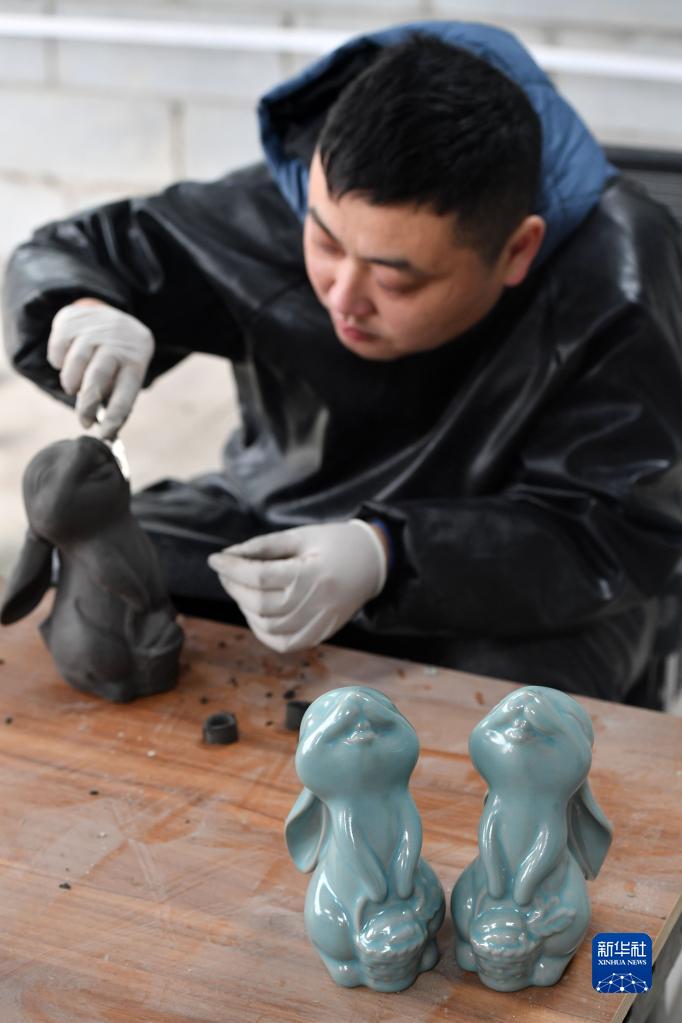 農歷兔年春節將至,河南省寶豐縣的汝瓷藝人以兔為題,創作造型各異、栩栩如生的汝瓷生肖兔作品,迎接新春佳節的到來。