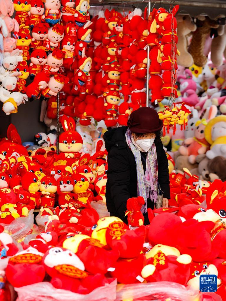 1月19日,市民在四川省成都市荷花池批發市場選購兔子造型的玩偶。