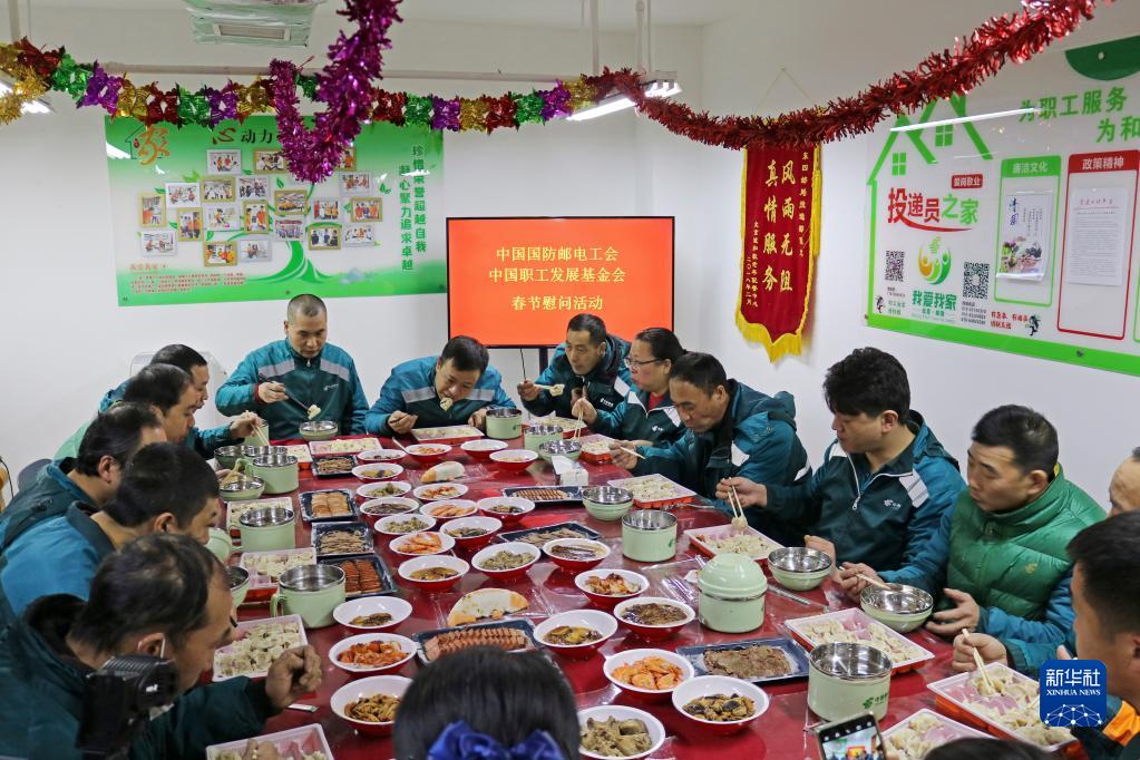 1月18日,在位于北京市東城區的中國郵政集團有限公司東四郵政支局,一線職工一起吃慰問活動送來的年夜飯菜品。