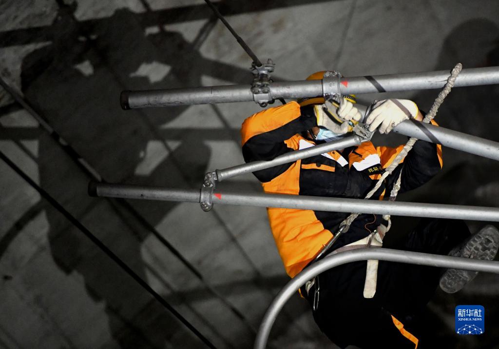 1月19日凌晨,鄭州高鐵基礎設施段作業人員對新鄭機場站北岔區接觸網支撐裝置進行檢修。