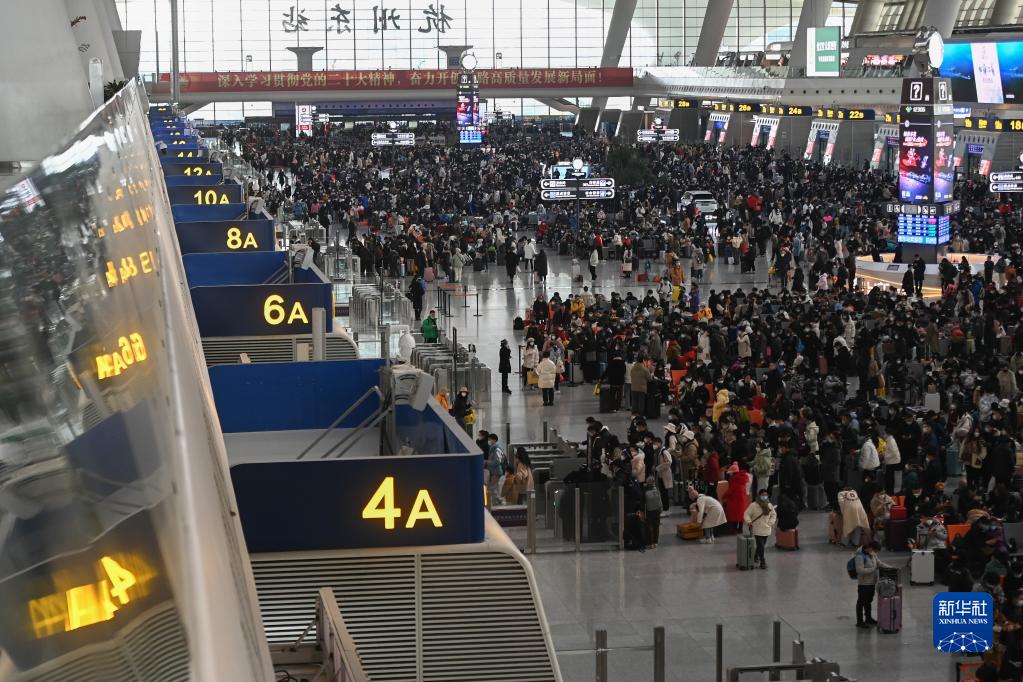 乘坐D2246/D2247次列車的旅客在杭州東站候車大廳排隊候車(1月18日攝)。