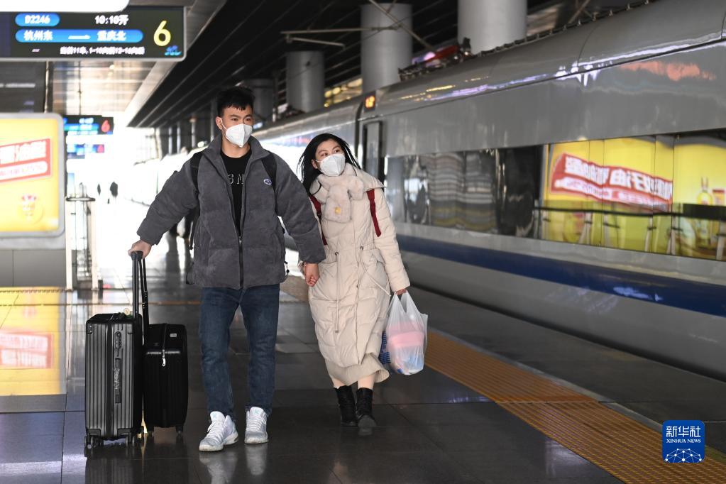 乘坐D2246/D2247次列車的返鄉旅客甘德鑫(左)與女友唐敏在杭州東站登車(1月18日攝)。24歲的甘德鑫與女友畢業于同一所大學,目前都在杭州工作,準備回到重慶過年,“雙方都見了家長”。