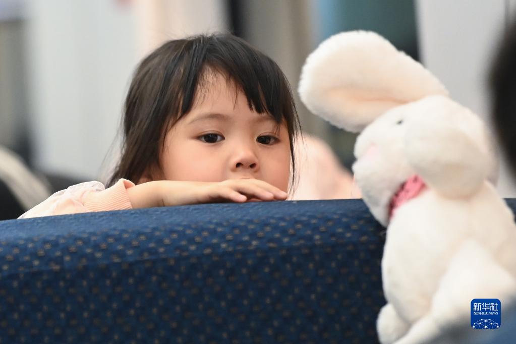 一名小女孩拿著兔子玩偶在D2246/D2247次列車上玩耍(1月18日攝)。