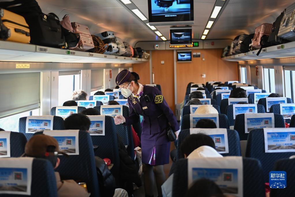 杭州客運段高鐵四車隊列車長劉娟萍在D2246/D2247次列車上了解旅客需求(1月18日攝)。