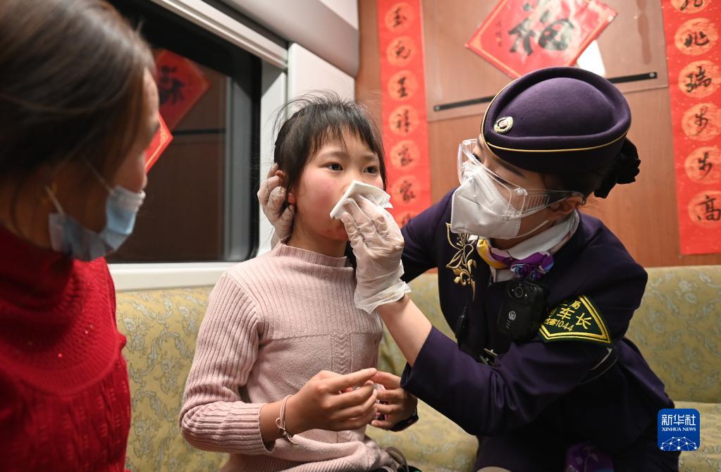 杭州客運段高鐵四車隊列車長劉娟萍(右)在D2246/D2247次列車上為一位流鼻血的女孩做緊急處理(1月18日攝)。