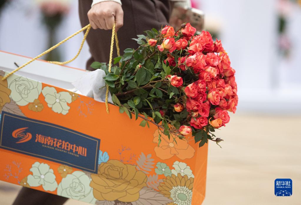 1月18日,顧客提著從海南熱帶花卉交易(拍賣)市場選購的鮮花。