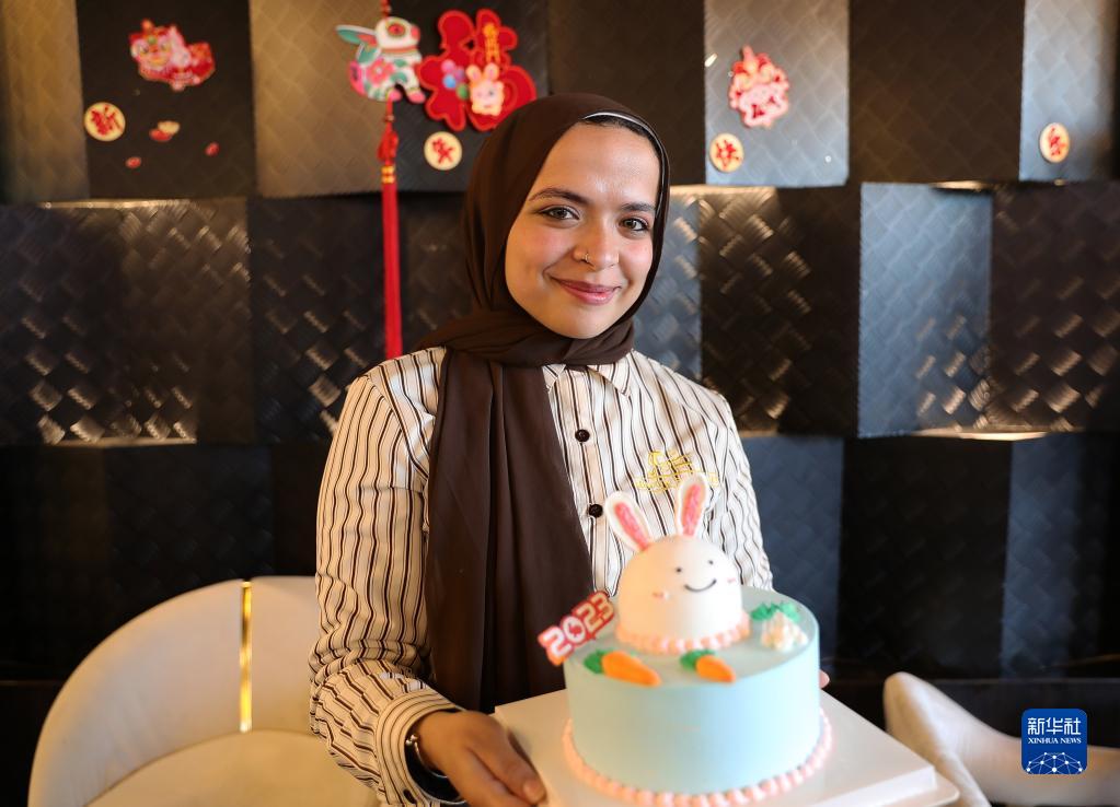 1月18日,一位店員在位于埃及首都開羅的一家烘焙坊內展示兔年主題的蛋糕。臨近中國農歷春節,這家烘焙坊推出兔年春節主題裝飾與商品,增添節日氣氛、吸引消費者。