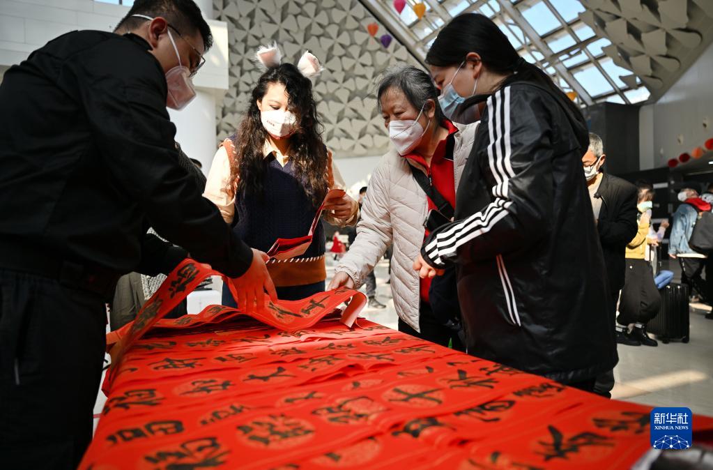 1月19日,??诿捞m國際機場的工作人員給旅客送春聯。