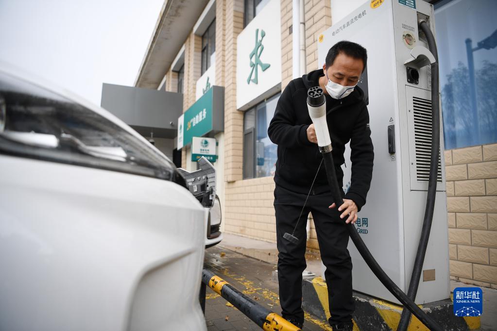 一名車主在國網寧夏電力石嘴山供電公司長勝供電所充電樁為車輛充電(2022年11月11日攝)。