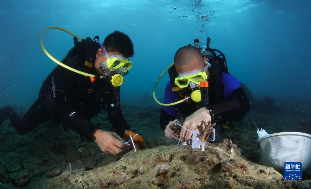 在海南省三亞市亞龍灣相關海域,潛水員在海底移植珊瑚(2022年11月17日攝)。