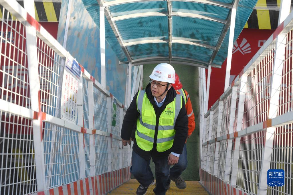 梅東冬在雄安新區至北京大興國際機場快線(R1線)一標段項目工地巡查(1月18日攝)。