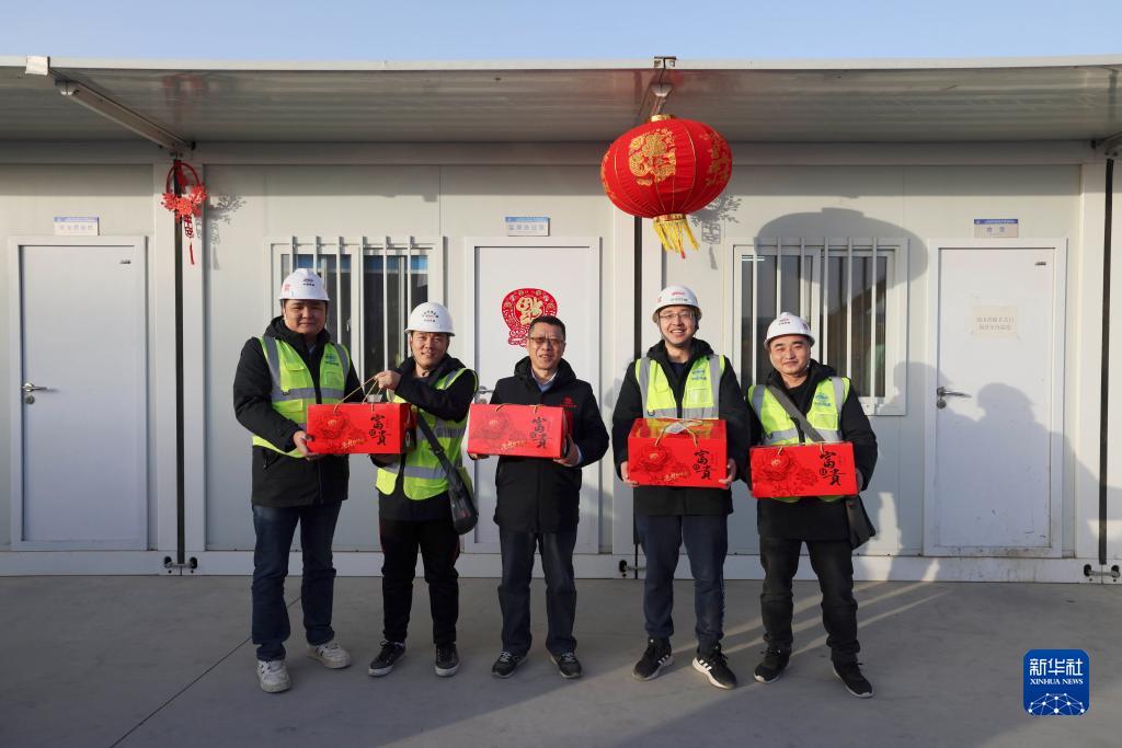 在雄安新區至北京大興國際機場快線(R1線)一標段項目部,梅東冬(中)把春節慰問品發放到工人手中(1月18日攝)。