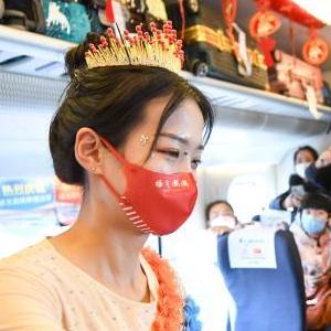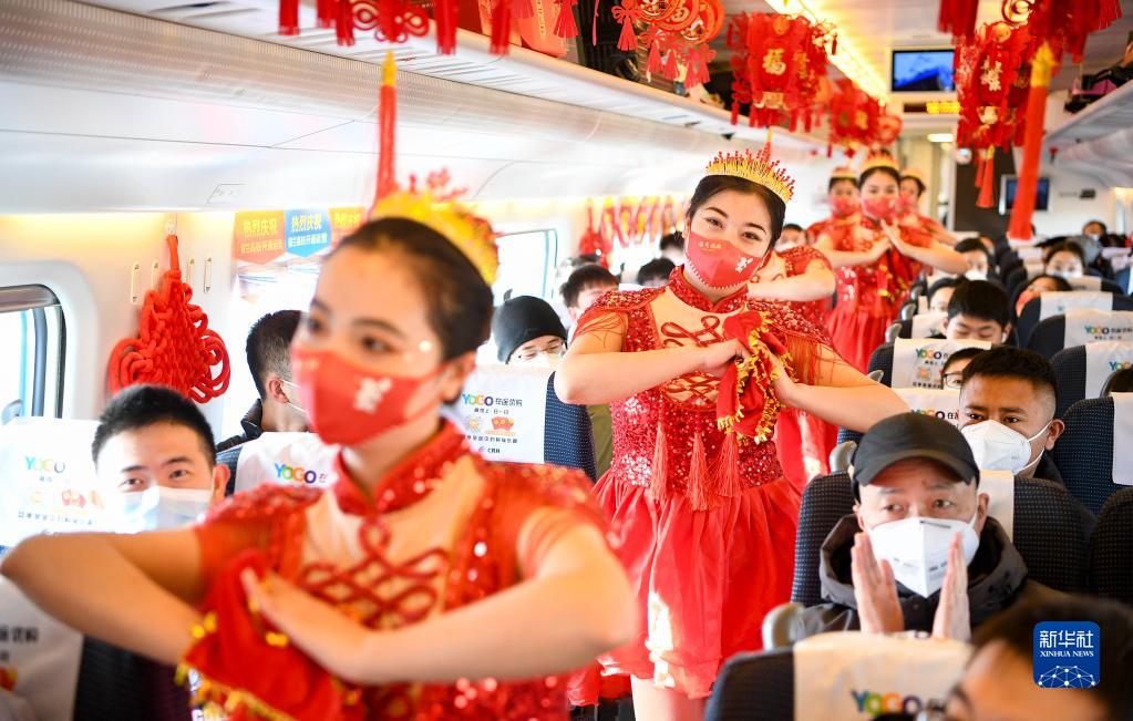 臨近春節,中國鐵路蘭州局集團有限公司銀川客運段將部分列車車廂裝扮一新,組織青年職工在列車上表演自編的節目,為旅客送上小禮物,讓人們將旅途中的歡樂帶回家。