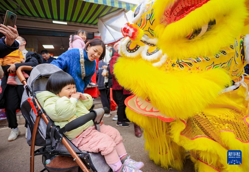 1月19日,在四川省遂寧市蓬溪縣蓬南鎮街頭,舞獅表演者與小朋友互動。