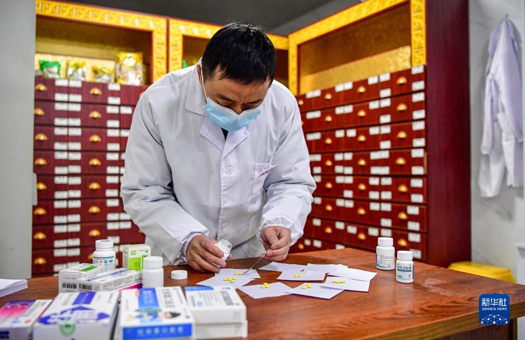 1月19日,北川縣曲山鎮任家坪村、石椅村聯合衛生室村醫趙太安在村衛生室分揀藥品。
