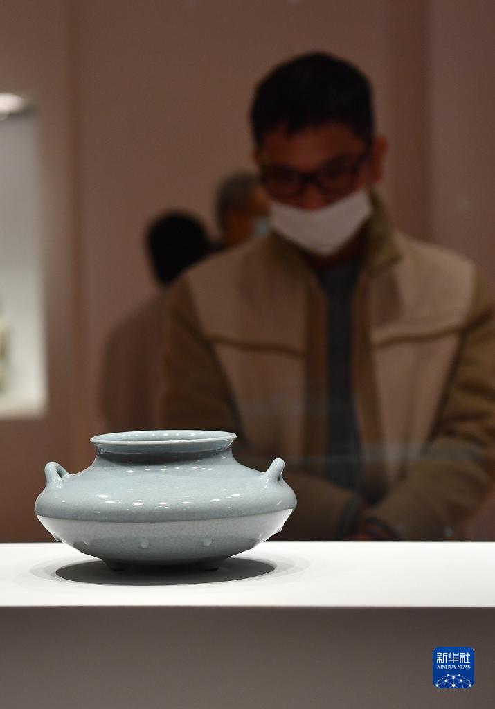 1月19日,觀眾在觀看“仿汝釉雙擊魚簍式花囊”。