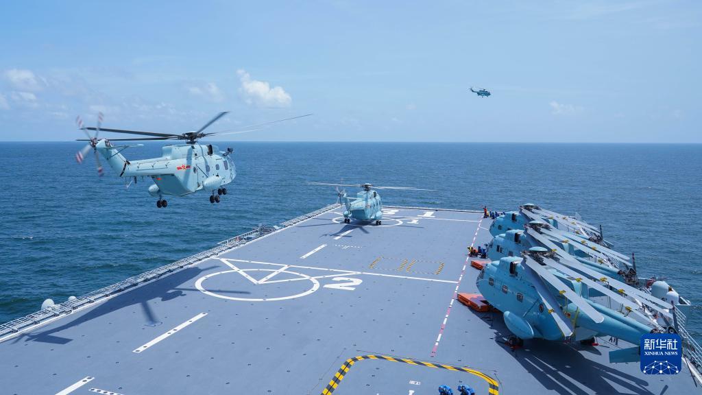 海南艦位南海某海域開展登陸演練,艦載直升機進行連續多波次起降訓練(資料照片)。