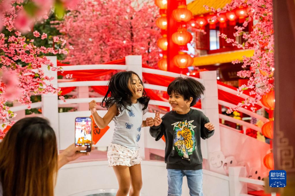 1月18日,在馬來西亞吉隆坡一家商場內,兒童在春節裝飾旁拍照。