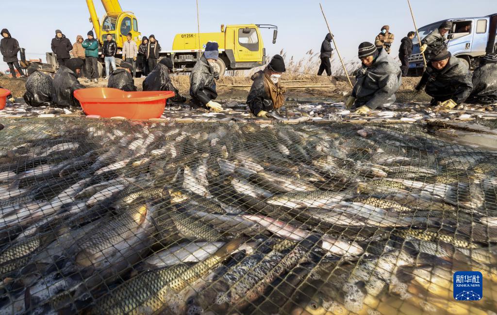 1月20日,唐山市豐南區老鋪村的村民在魚塘捕撈淡水魚。