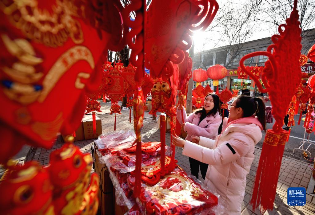春節將至,在河北省邢臺市南和區的年貨集市,不少市民選購節慶飾品、春聯、福字等年貨,迎接新春佳節的到來。