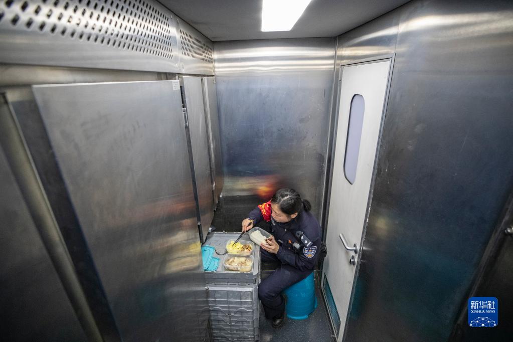1月16日,在貴陽北開往西安北的D1703次列車上, 重慶鐵路公安處乘警支隊“芳華”女子乘務警組的朱小麗巡視完車廂后吃午飯。