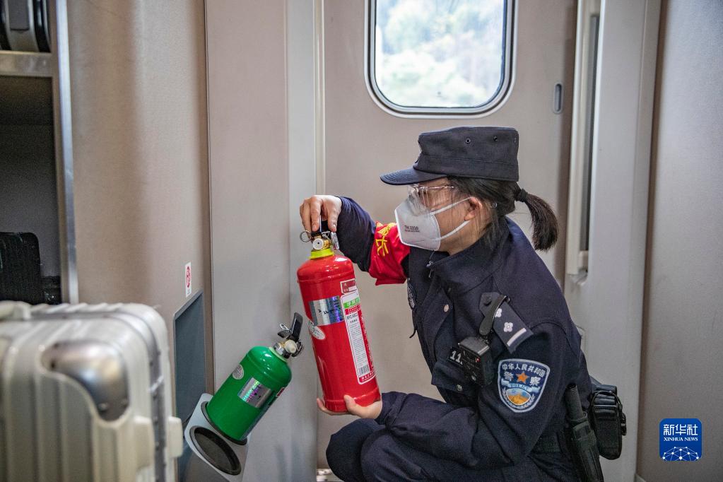 1月16日,在貴陽北開往西安北的D1703次列車上, 重慶鐵路公安處乘警支隊“芳華”女子乘務警組的朱小麗在查驗列車消防器材。