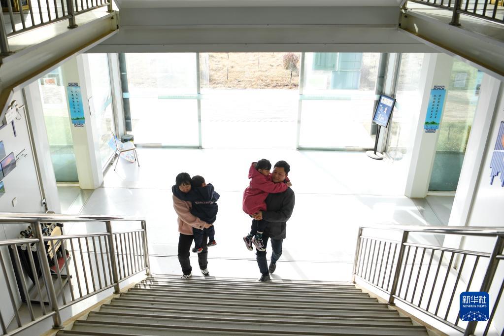1月19日,李輝和妻子抱著孩子們在項目部內行走。