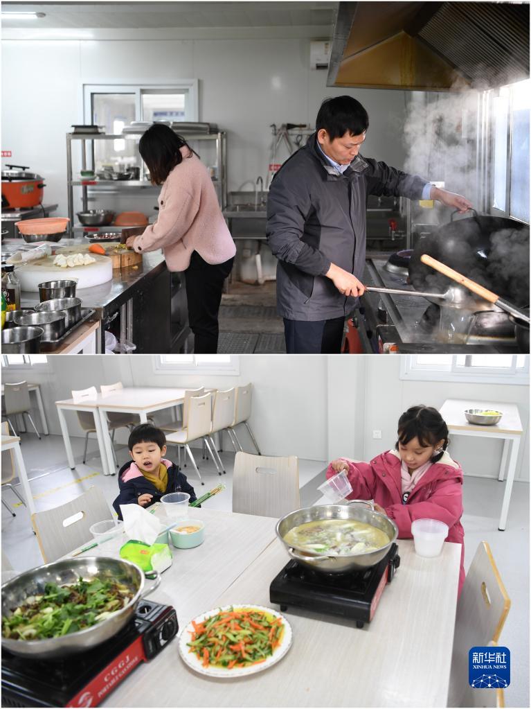 拼版照片:上圖為1月19日,李輝(右)夫妻在項目部食堂準備午飯;下圖為1月19日,李輝的女兒和兒子在午飯前擺放碗筷。
