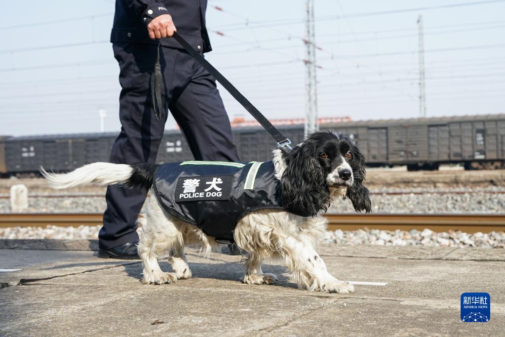 1月18日,警犬“和平”在民警王支斌的帶領下在車站內巡邏。