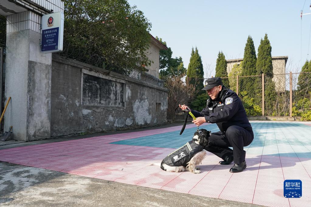 1月18日,民警王支斌為警犬“和平”在裕溪口警務室前整理警犬服。