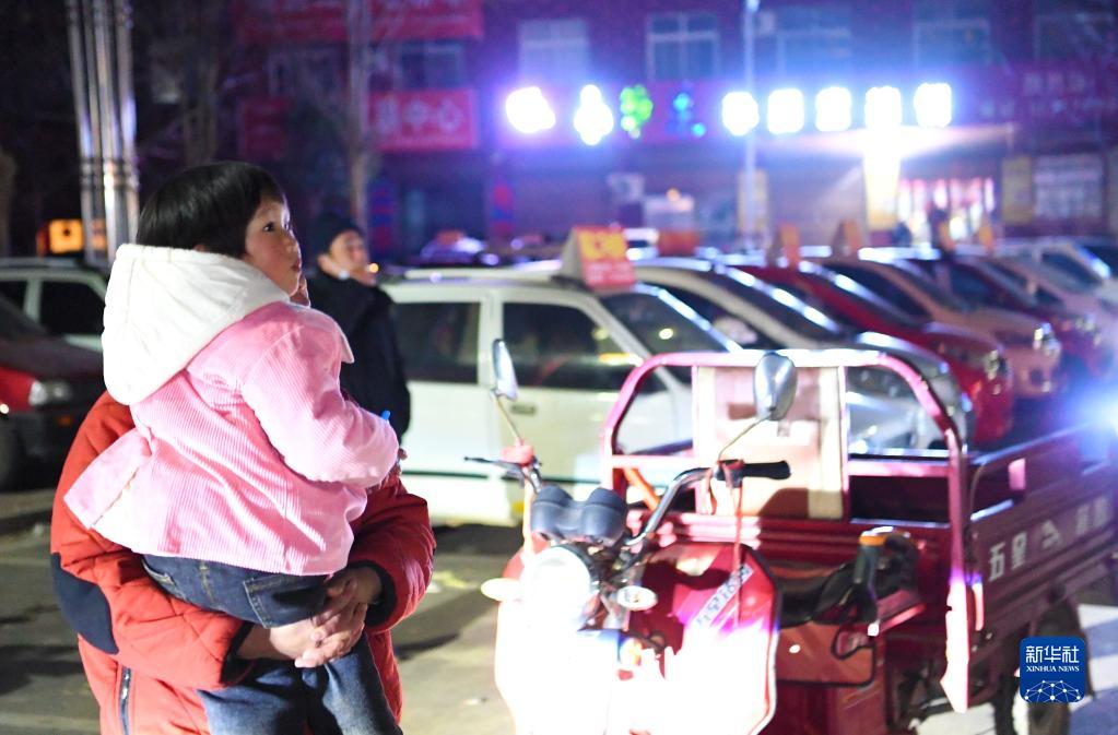 1月18日晚,女兒靳佳穎和爺爺奶奶來到村廣場,等候父母返鄉乘坐的長途大巴。