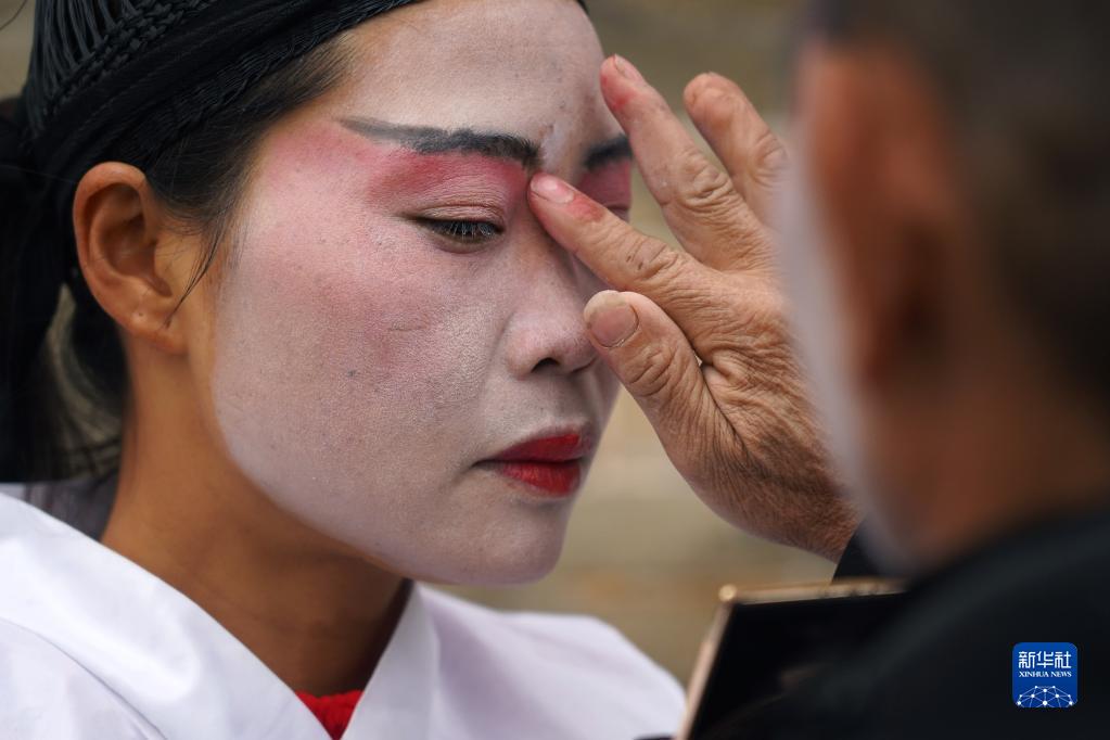 1月20日,在江西省廣昌縣甘竹鎮龍溪村,廣昌縣旴源農民劇團的演員在演出孟戲前化妝。