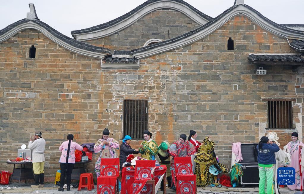 1月20日,在江西省廣昌縣甘竹鎮龍溪村,廣昌縣旴源農民劇團的演員在演出孟戲前做準備。