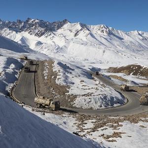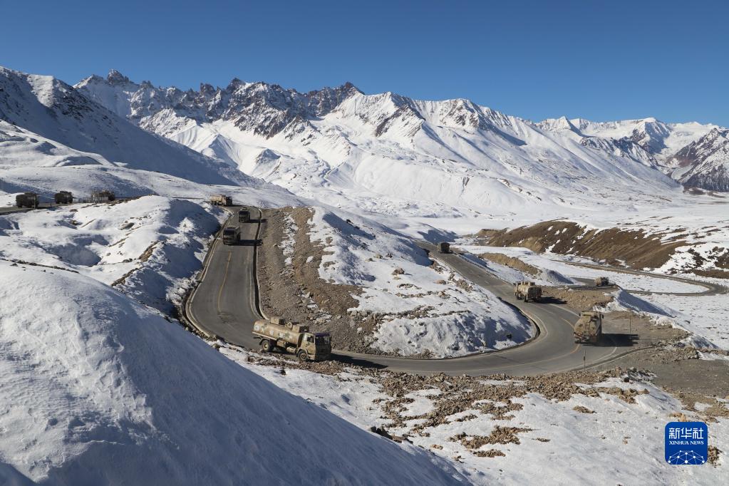 西藏軍區川藏兵站部某運輸旅油料運輸營官兵駕駛滿載油料的運輸車翻越海拔4900米的德姆拉山(2022年11月18日攝)。新華社發(賈宇翔 攝)