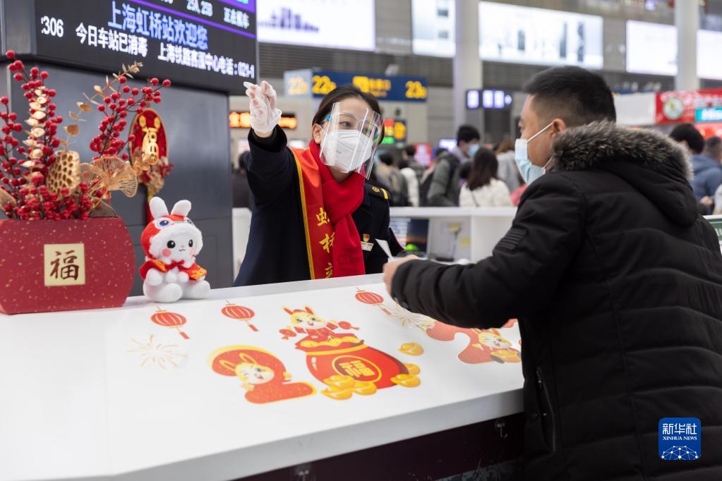 1月21日,上海虹橋火車站“心尚”服務工作室客運值班員周絢解答旅客問詢。
