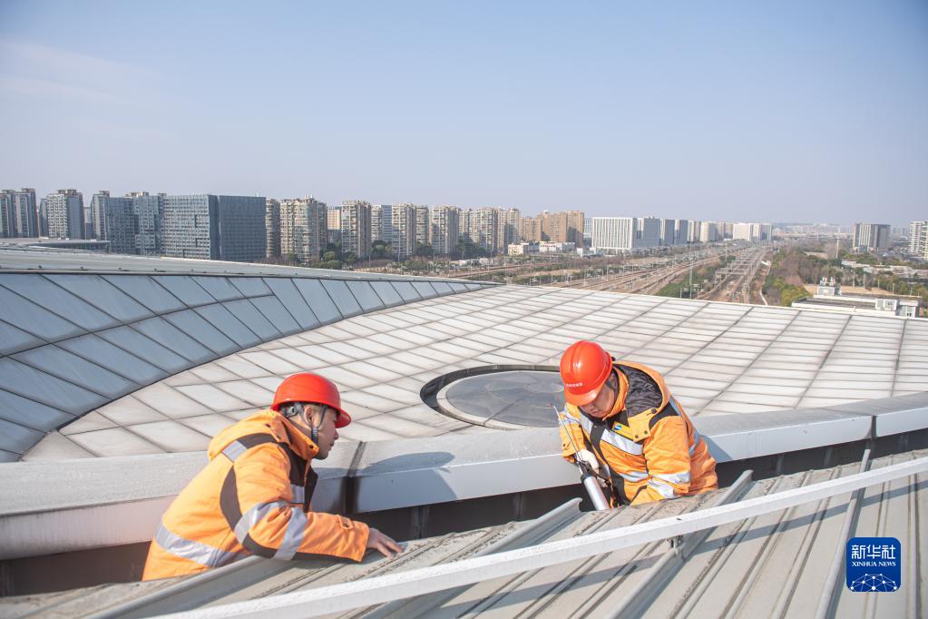 1月21日,杭州房建公寓段工人徐烜泱(右)與金一鳴在杭州東站屋面進行巡檢。