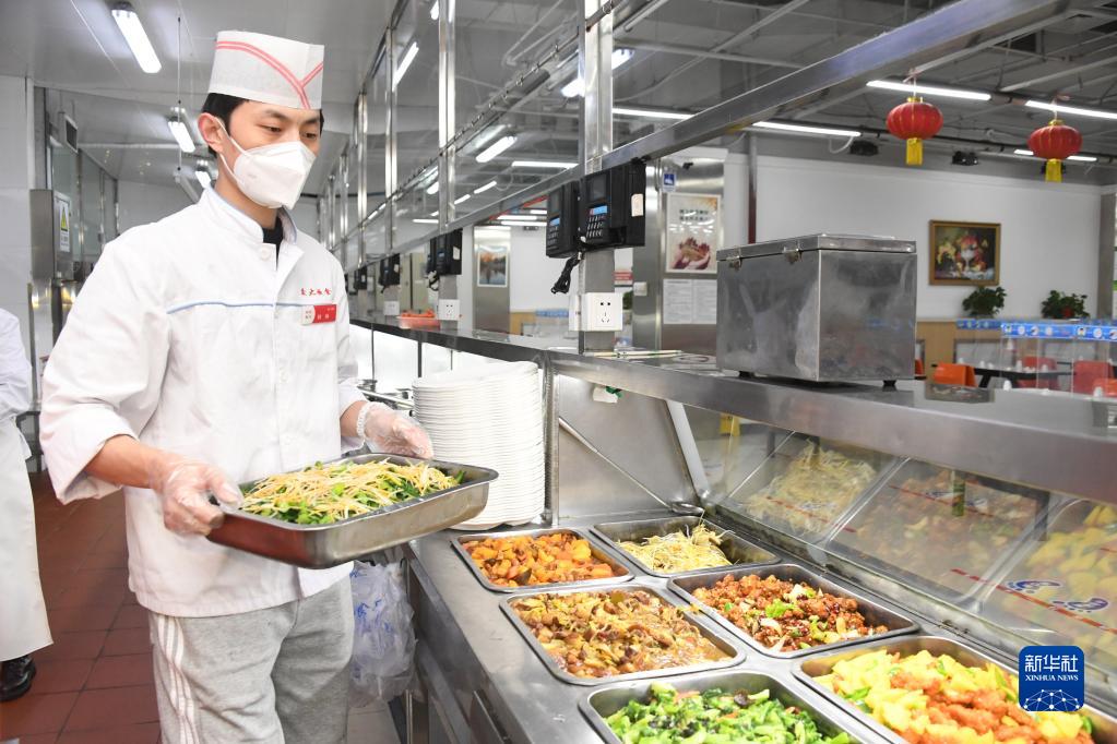1月21日,在北京交通大學學苑餐廳,工作人員將制作好的午餐放入窗口。